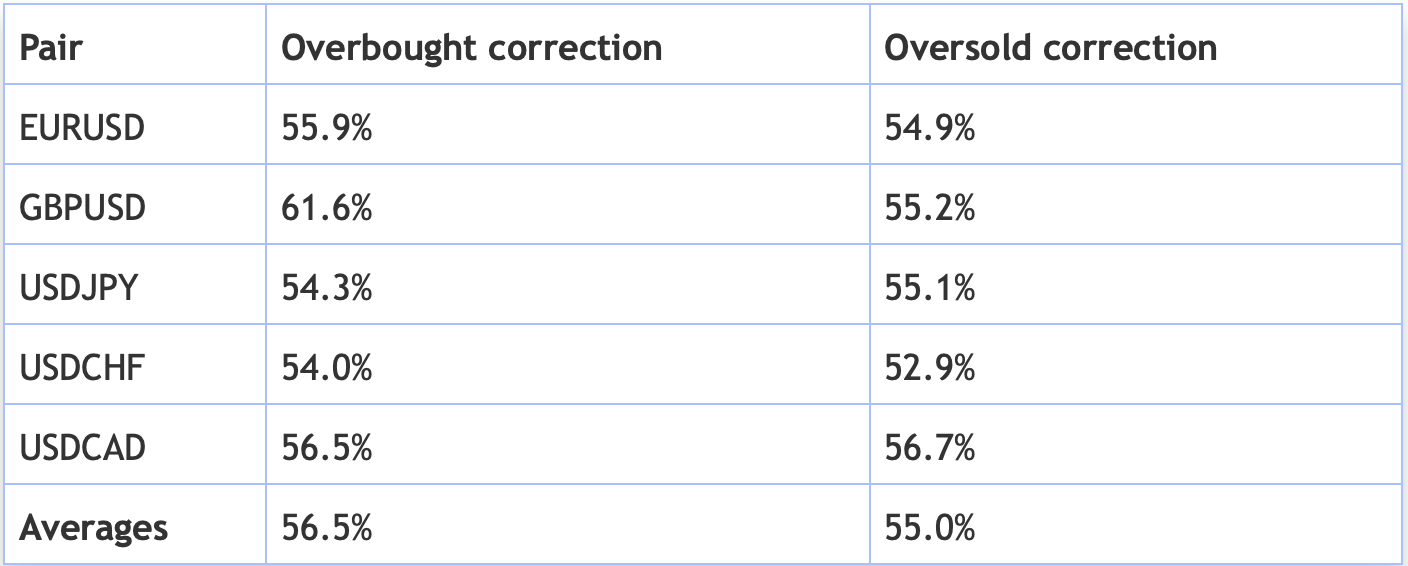 以欧元兑美元为例,当市场出现超买时,此后55.9%的时间再次下跌。在54.9%的情况下,欧元兑美元在超卖后立即再次走高。