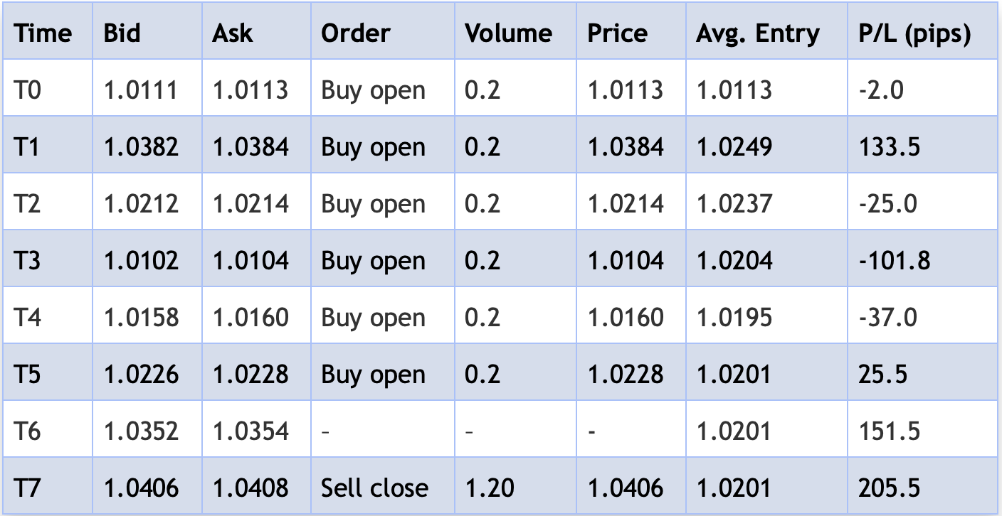 假设我们要持多头头寸,并使用1标准手的大小。使用具有5个级别的垂直网格,交易块被分为5个块,每个块的大小为0.2手。然后,我们以设定的时间间隔进入市场,每笔交易有0.2手的5笔交易。图1演示。